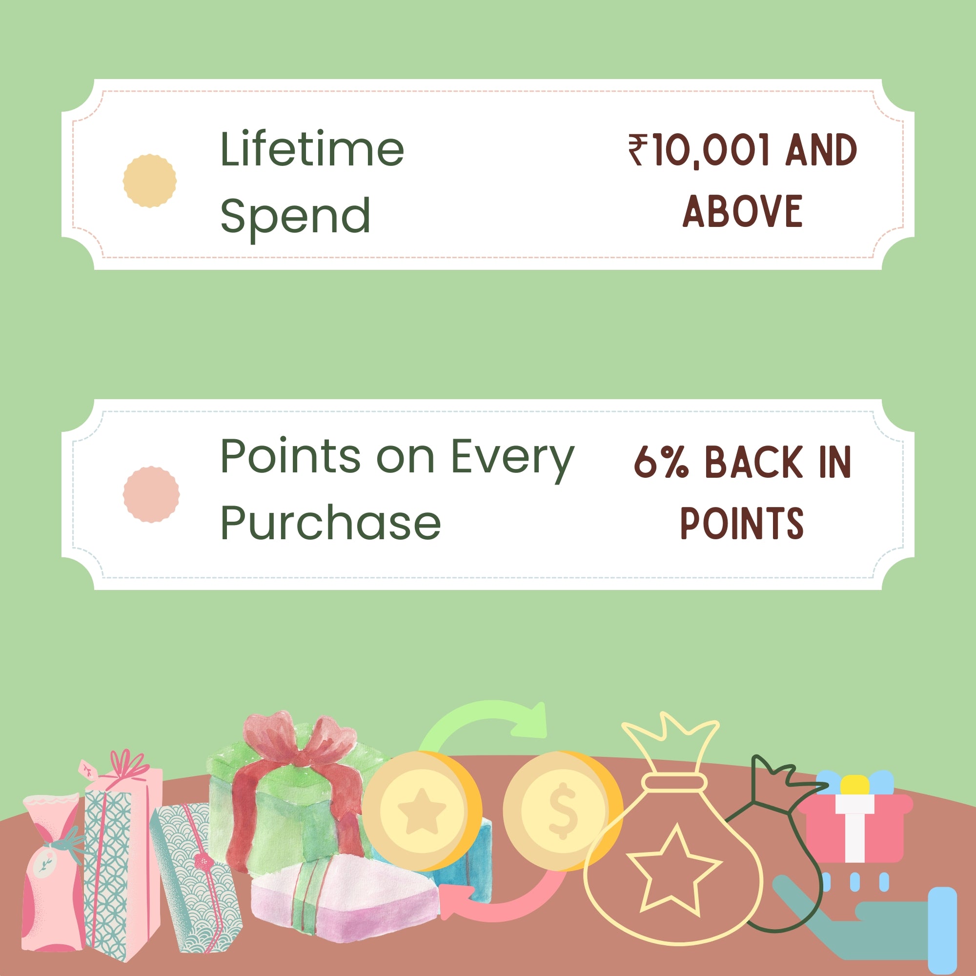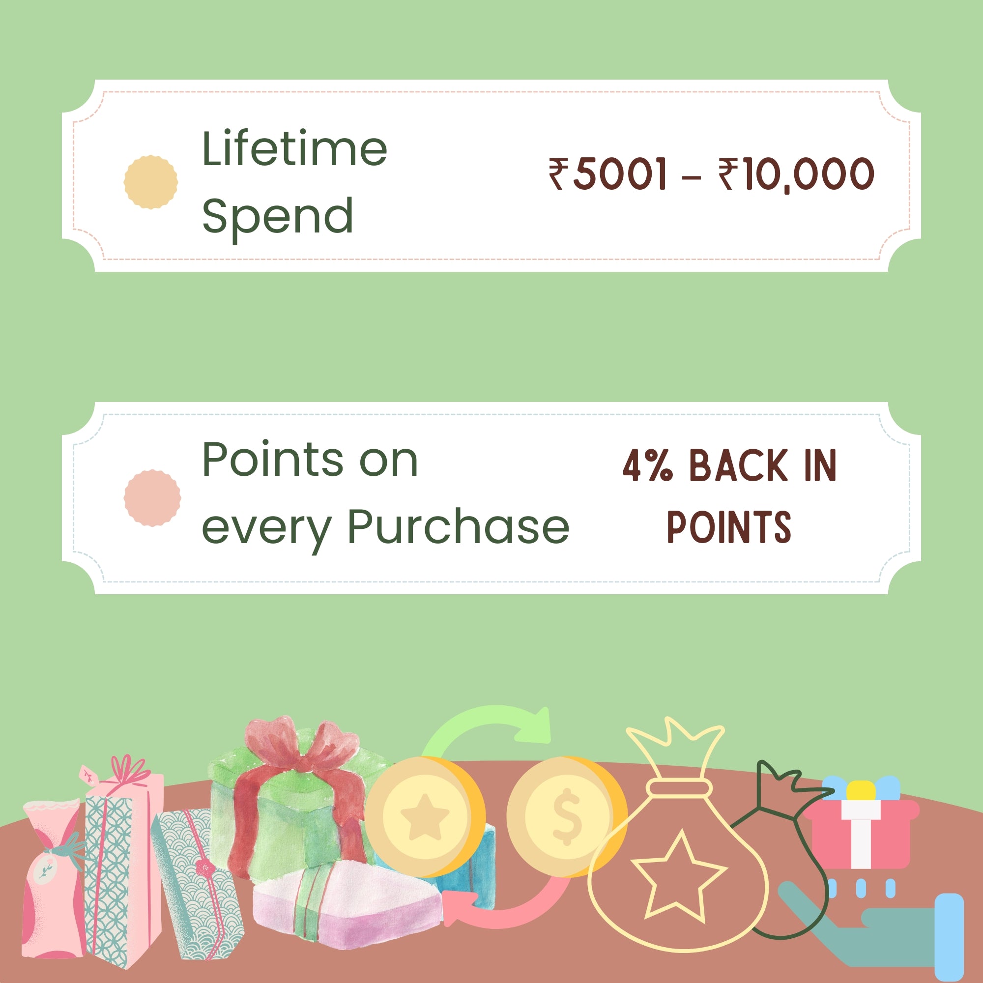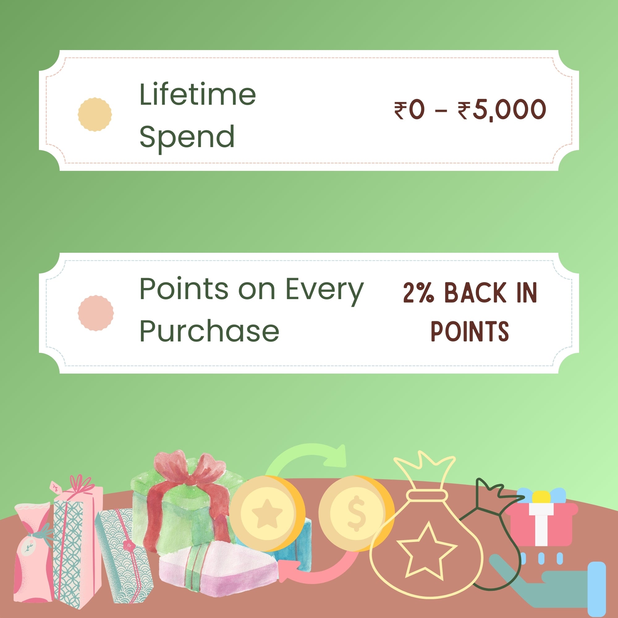 Example: If you're a Bumz Beginner member and make a ₹1000 purchase, you'll earn 2% i.e. 20 points (worth ₹20). Keep shopping and you’ll level up to higher tiers with more rewards per rupee spent!
